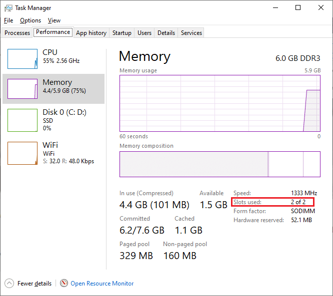 للتحقق من ذلك ادخل إلى مُدير المهام Task Manager وانتقل لنافذة Performance وانتبه للمعلومات الخاصة بالرام الموجودة في الأسفل. بجانب Slots Used يمكنك معرفة عدد المنافذ المتاحة وعدد المستخدم منها.