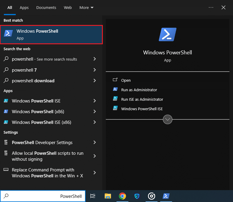 عليك أولاً فتح PowerShell وذلك بعد البحث عنه ضمن ميزة البحث المجاورة لقائمة ابدأ. علماً أنه لا يوجد داعٍ لتشغيل PowerShell بميزات المسؤول إلّا أن ذلك لا يضر أيضاً.