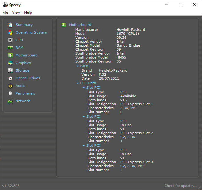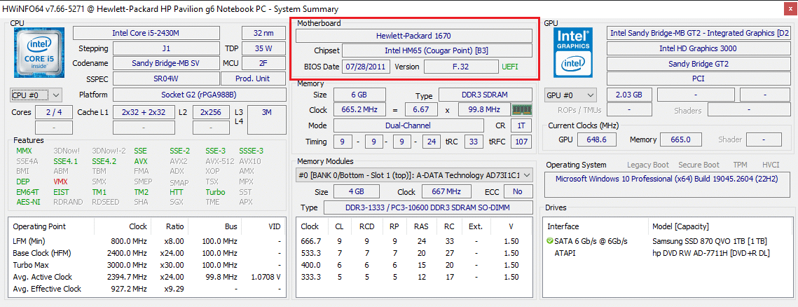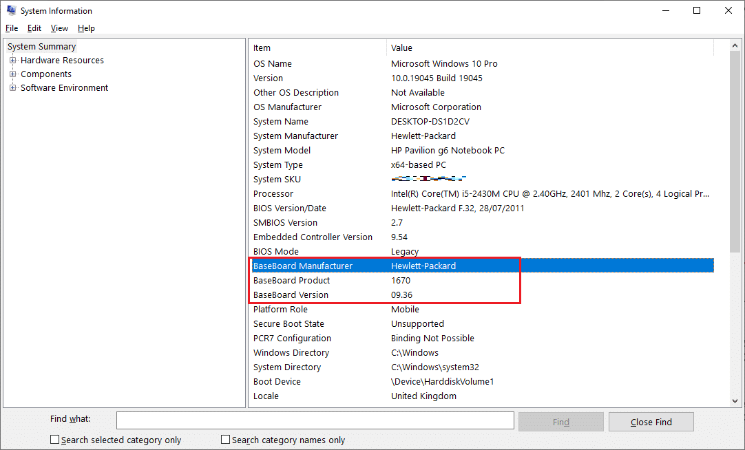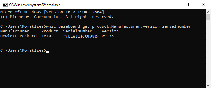 لاحظ هنا أن اللوحة الأم من تصنيع شركة Hewlett-Packard (وهي ذاتها شركة Hp للإلكترونيات)، بالإضافة إلى رقمها التسلسلي SerialNumber.