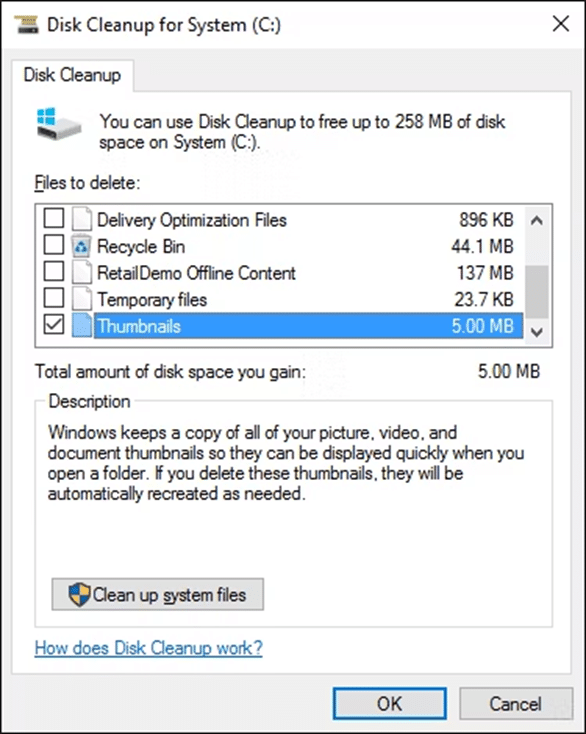 تحت علامة التبويب “تنظيف القرص Disk Cleanup“، أزل تحديد جميع المربعات ما عدا المربع المسمى Thumbnails ثم اضغط “موافق OK “.