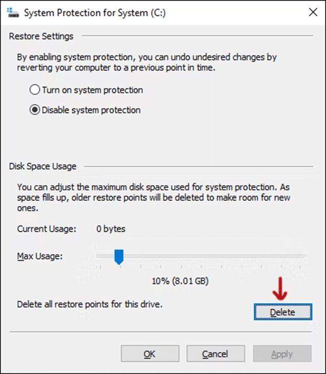 بإمكانك تفريغ هذه المساحة من خلال حذف نقاط الاستعادة المحتفظ بها. أضف لهذا قد ترغب بتقليل المساحة المخصصة لها، ولكن عليك الحذر حيث أنّ تخصيص القليل من المساحة لها فقط قد يؤدي إلى حدوث خلل أثنناء عملية استعادة النظام.