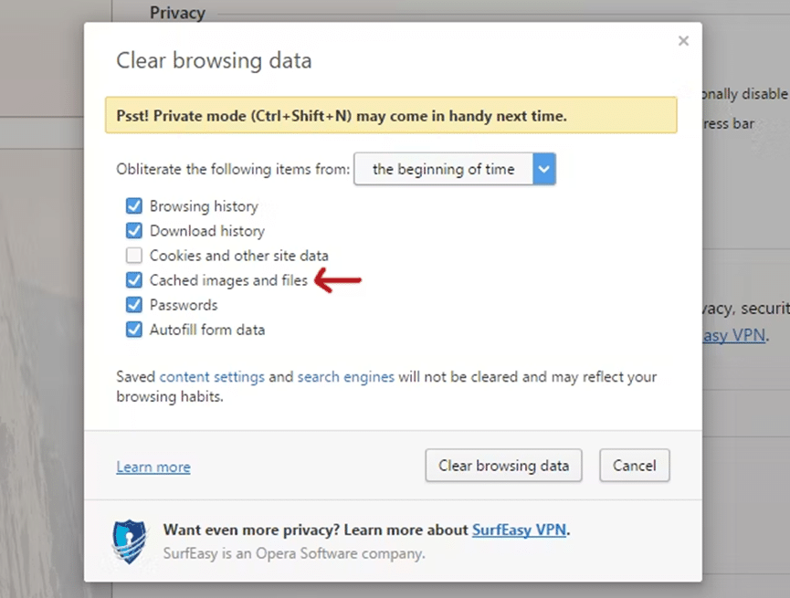 في متصفح Opera، افتح قائمة الإعدادات، ومن قسم الخصوصية والأمان Privacy & Security ، اختر الخصوصية Privacy ، اضغط على مسح بيانات التصفح Clear Browsing Data، وقم باختيار الصور والملفات المخزنة مؤقتًا Cached Images and Files ، وقم بالمسح من “بداية الوقت the beginning of time “.