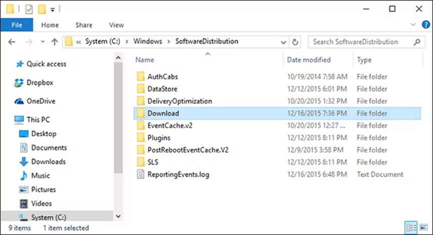 ثمّ، افتح مدير الملفات File Explorer وانتقل إلى C:\Windows\SoftwareDistribution\Download. الان، بإمكانك أن تحذف أي ملف هنا بأمان. ولا تنسى بعد هذا أن تعيد تمكين تحديث الويندوز عن طريق كتابة ما يلي في Command Prompt: