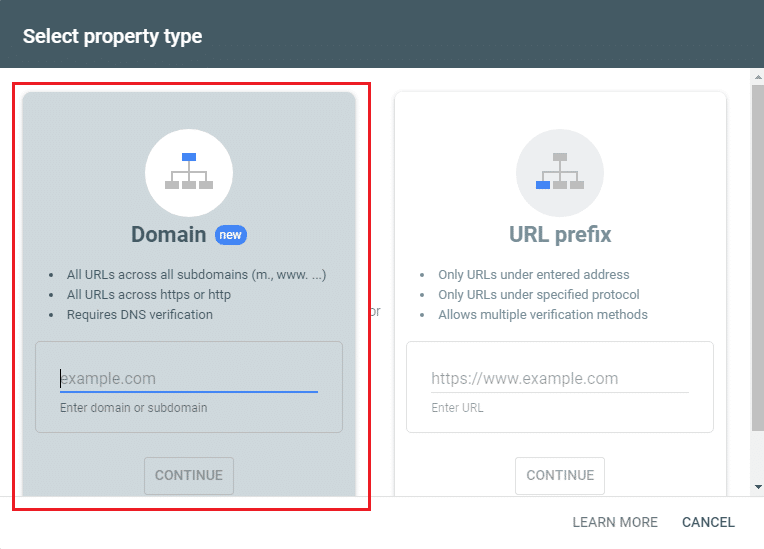 الخطوة التالية هي إضافة موقعك. لاحظ أن بإمكانك إضافة نطاق Domain كامل أو مسار محدد (مثل نسخة الموقع التي تبدأ بـhttps أو http). وننصحك هنا بإدخال نطاق الموقع دون أي إضافات في قسم “نطاق” أو “Domain” مثل example.com