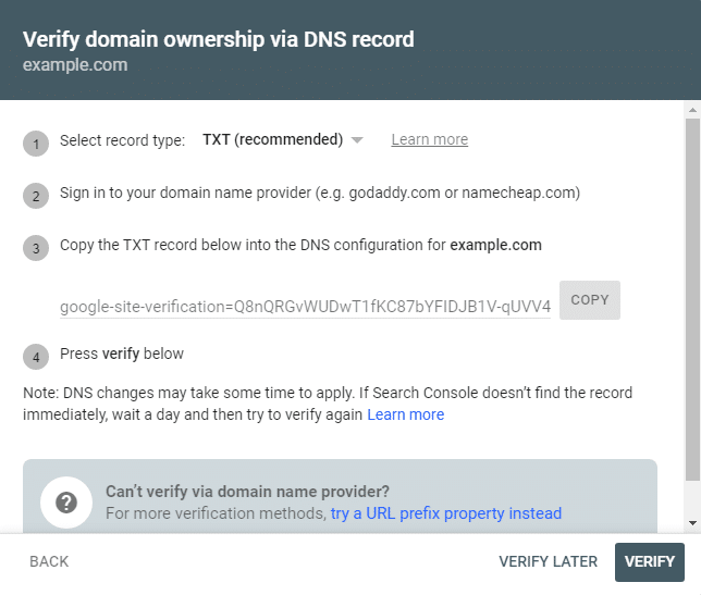 1. من خلال سجلات CNAME أو TXT: حيث يزوّدك GSC بكود قصير عليك نسخه وإضافة سجل TXT أو CNAME جديد لمزوّد خدمة DNS الخاص بك (كـCloudFlare). يمكنك ذلك أيضاً من خلال cPanel كما شرحنا سابقاً. ولكن هذه الطريقة قد تكون صعبة بعض الشيء خصوصاً على غير المختصين.