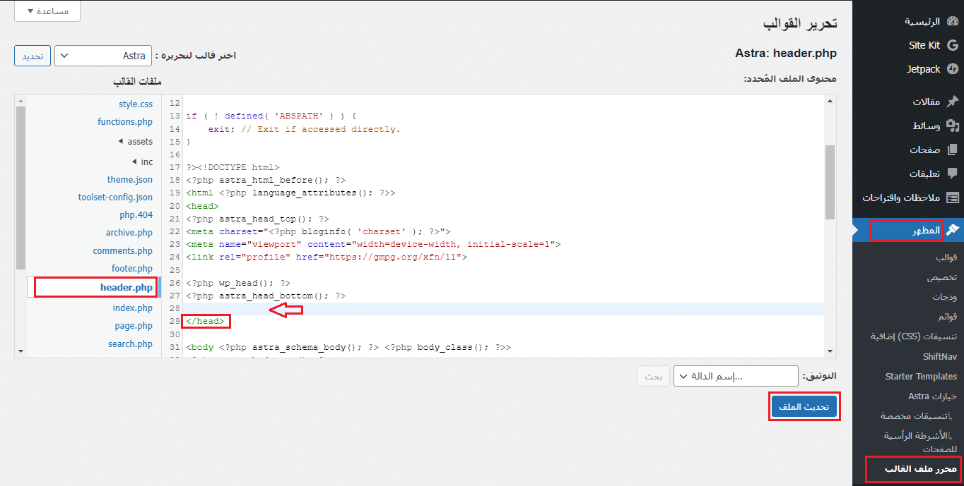 إضافة كود HTML لملف header في محرر ملف القالب في الووردبريس
