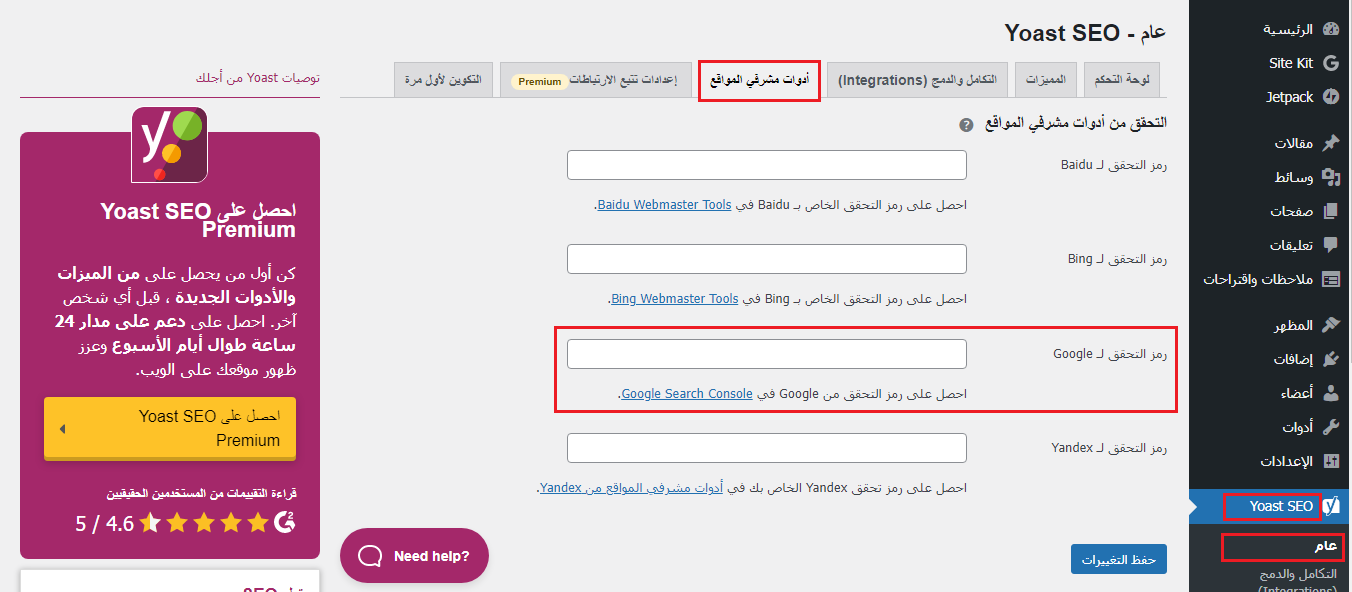 يمكنك بشكل بديل -وإذا كنت تستخدم إضافة Yoast SEO- الذهاب لصفحة “عام” ضمنها، ومن ثم “أدوات مشرفي المواقع” ولصق الكود في المكان المخصص.