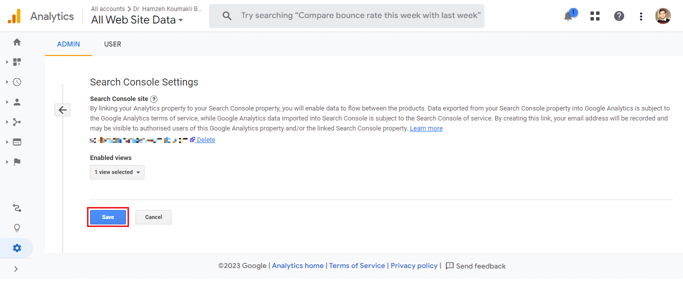 قد يوجّهك الـGSC من تلقاء نفسه لربط هاتين الأداتين بعد إتمام إضافة موقعك، ولكن يمكن القيام بذلك أيضاً من خلال Google Analytics واختيار Admin ثم Property Settings ثم ابحث عن Adjust Search Console واضغط عليه