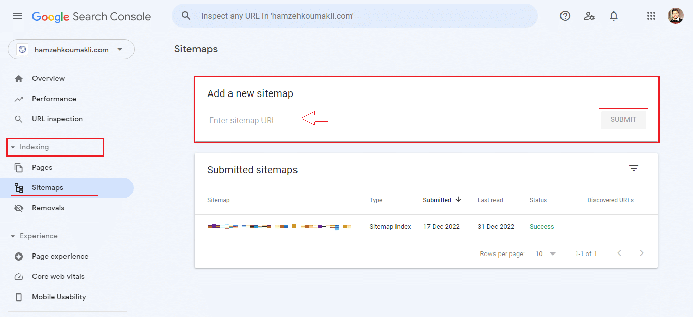 لإضافة هذا الملف لـGSC عليك أولاً نسخ رابط خريطة الموقع، ومن ثم في أدوات مشرفي المواقع اختر Sitemaps من الشريط الجانبي تحت Indexing. ومن ثم لصق الرابط في المكان المخصص واختيار Submit