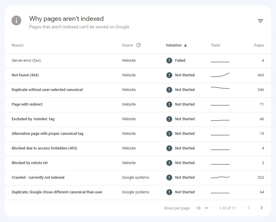 عموماً، عند النزول لأسفل الصفحة سيعرض لك GSC الأسباب التي منعت غوغل من أرشفة بعض الصفحات: