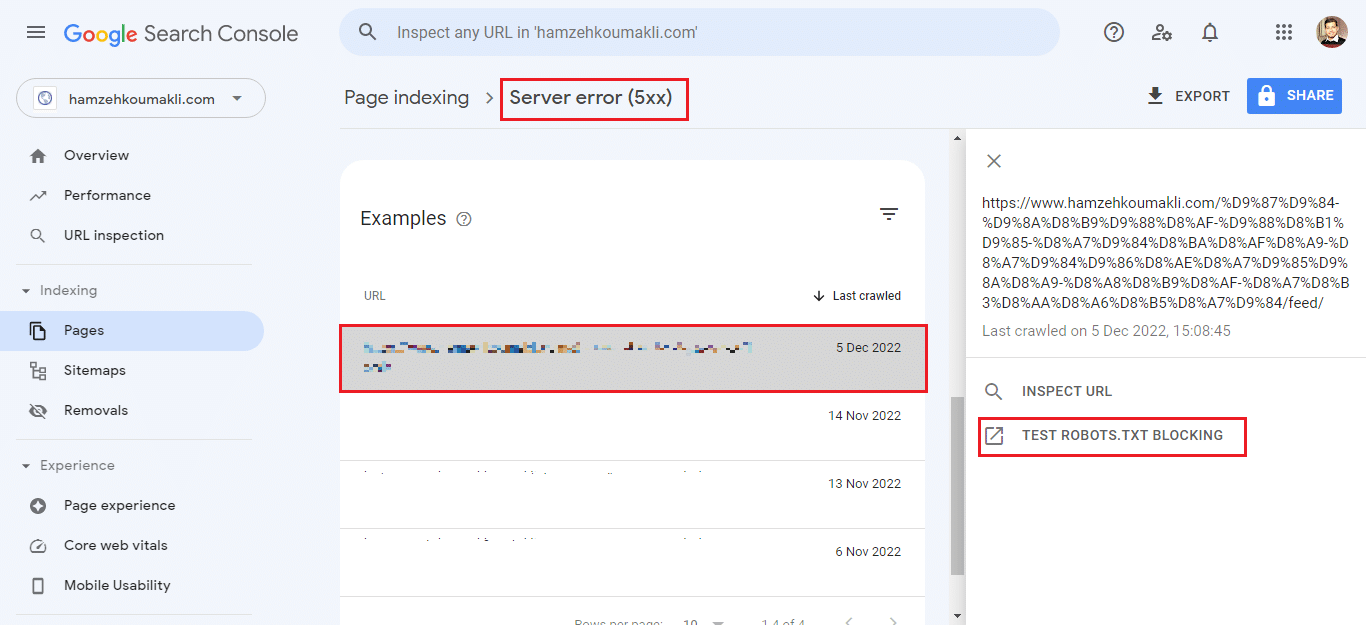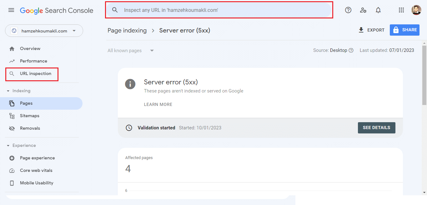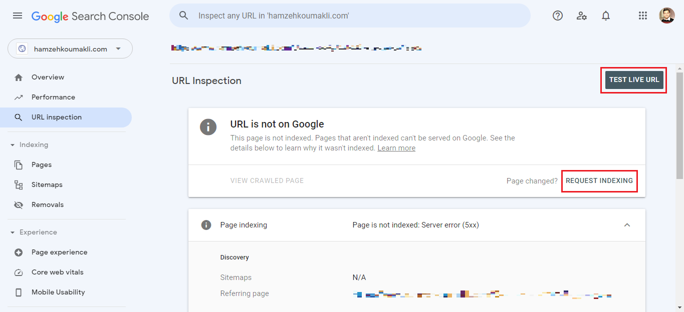 وهي مشكلة شائعة وعادةً ما تكون عابرة. لحلها بدايةً عليك التحقق من أن الصفحة متوقفة فعلاً عن العمل، جرّب مثلاً زيارتها في المتصفح (يُفَضّل في وضع Incognito)، غالباً ستجد أن هذه الصفحة تعمل بشكل طبيعي. لذا فإن الخطوة التالية هي فحص الرابط باستخدام URL Inspection Tool.