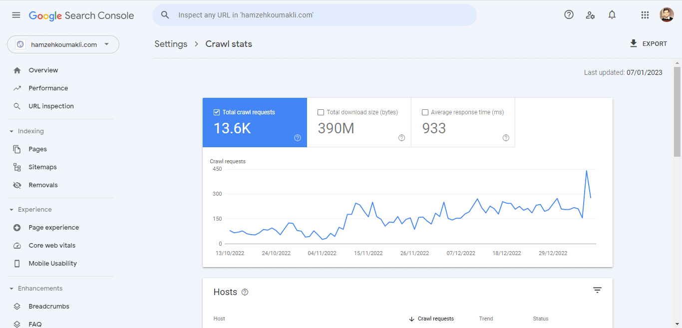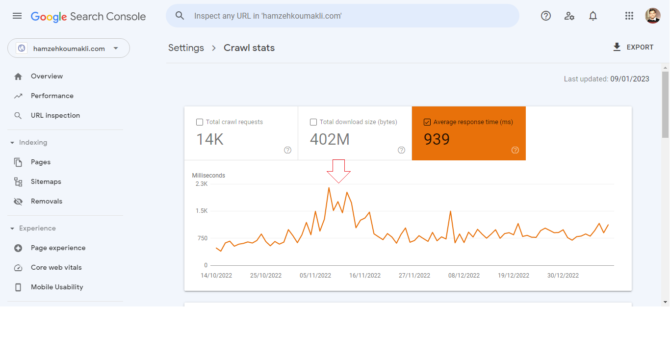 في حال وجود أي ارتفاعات في زمن الاستجابة (كما في الصورة) فهذا يعني أن غوغل احتاجت وقتاً طويلاً لتتمكن من الزحف إلى بعض صفحات موقعك وأرشفتها. وهذا قد يستهلك الكثير من crawl budget. فحسب تعبير غوغل أن استجابة السيرفر السريعة تعني أنه سليم، وستتمكن عناكب غوغل من أرشفته وزيارة عدد صفحات أكبر فيه.