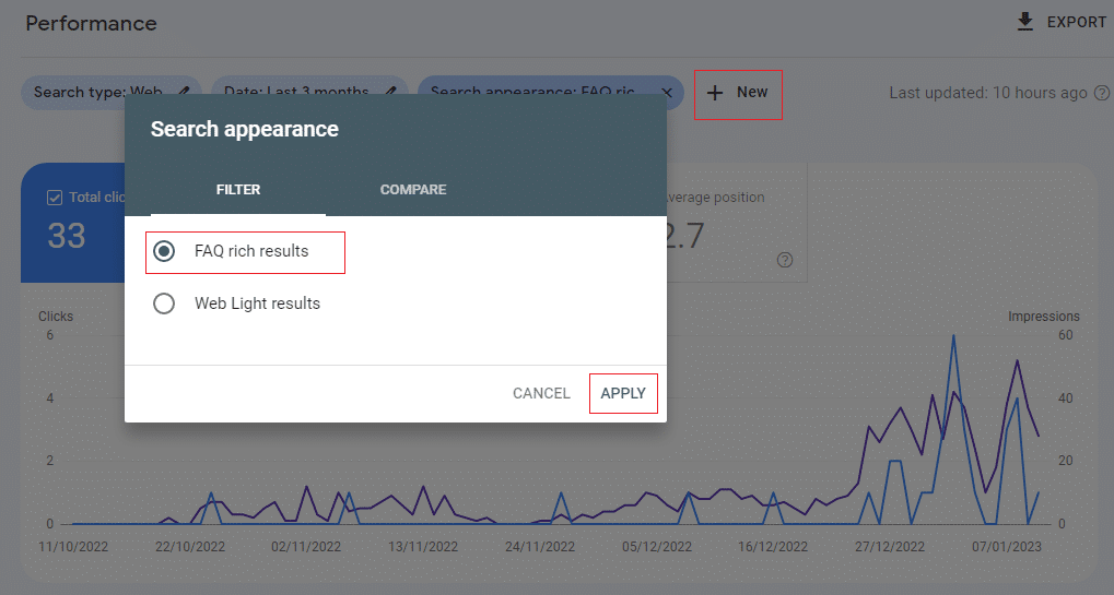 يمكنك معرفة صفحاتك التي تجلب زوّاراً بهذه الطريقة من خلال إضافة فلتر جديد New+ ومن ثم اختيار FAQ rich results: