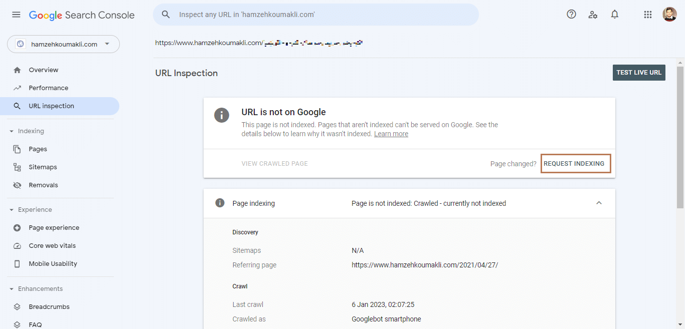 سيقوم عندها Googlebot بـ”الزحف” للصفحة وفحصها مباشرة. فإذا كانت تعمل فعلاً يمكنك طلب أرشفتها Request Indexing أو فحصها من خلال Test Live URL