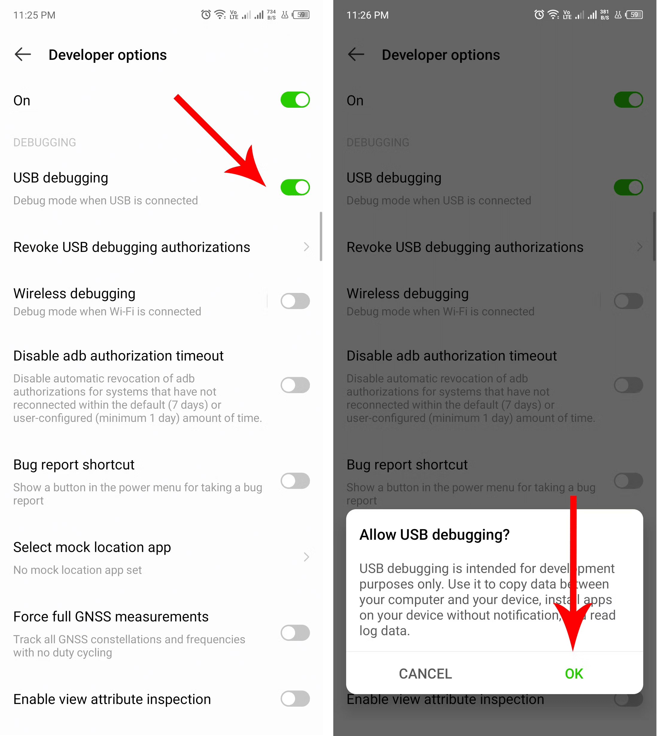 والآن انتقل لصفحة الإعدادات الرئيسية ثم اختر System ثم Developer Options ثم USB Debugging وقم بتفعيل خيار USB Debugging واختر OK للتأكيد.