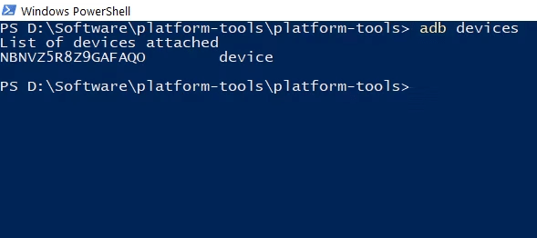 والآن لاختبار اتصال ADB انسخ الأمر التالي والصقه في برنامج PowerShell في حاسوبك وانقر Enter