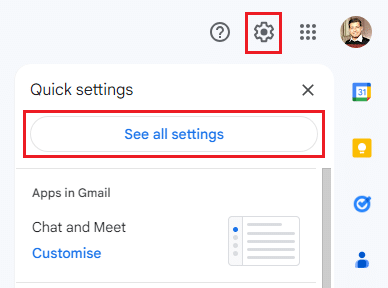 وهذه الخطوة أساسية وهامة جداً. للقيام بذلك اضغط على أيقونة الإعدادات في الـGmail ثم اختر See All Settings لعرض جميع الإعدادات.