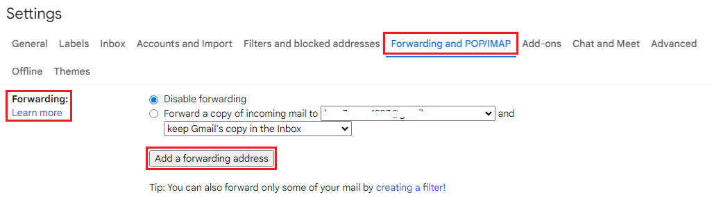 بعد ذلك اختر نافذة Forwarding and POP/IMAP وضمن قسم Forwarding اختر Add a Forwarding Address