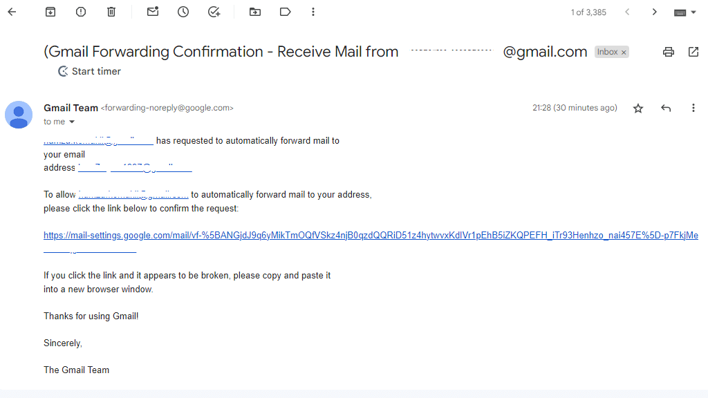 سيرسل بعدها الـGmail رابطاً لعنوان البريد الإلكتروني الجديد لتأكيد موافقته على إضافته إلى قائمة إعادة التوجيه. ولإنهاء هذه الخطوة عليك الذهاب إلى الإيميل الجديد والبحث عن رسالة من Gmail Team تحتوي على رابط لتأكيد العملية. انقر على الرابط ومن ثم وافق على أي طلبات يطلبها منك Gmail.