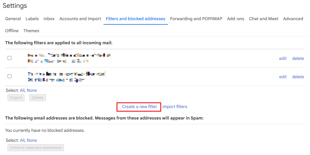 الطريقة الأولى لإنشاء فلتر جديد هي من نفس المكان الذي أنهيت فيه الخطوة السابقة. حيث ستجد خيار create a filter كما هو موضح في الصورة.