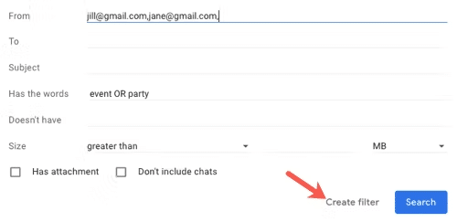 ضمن خيارات الفلتر عليك ملء خانة واحدة على الأقل من السابقة، فمثلاً إذا كنت تريد جعل هذا الإيميل لأمور العمل فيمكنك تحويل الرسائل التي تصلك من أقربائك أو أصدقائك إلى إيميل آخر مخصص لهذا الغرض. ويمكنك ذلك عن طريق خيار From.