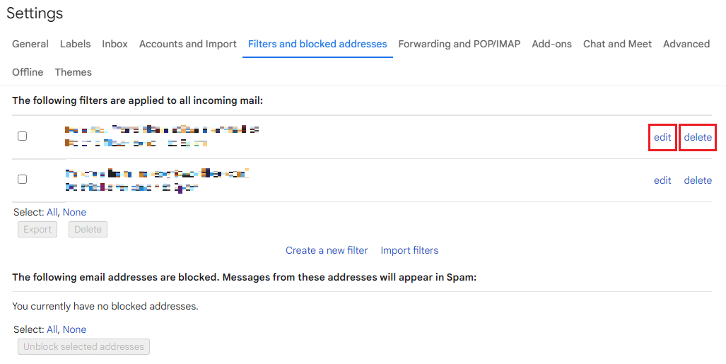 يمكنك حذف أو تعديل الفلتر الجديد وذلك من خلال نافذة Filters and Blocked Addresses ذاتها، حيث تحتوي هذه النافذة على كل الفلاتر التي قمت بإنشائها بغض النظر عن وظيفتها.