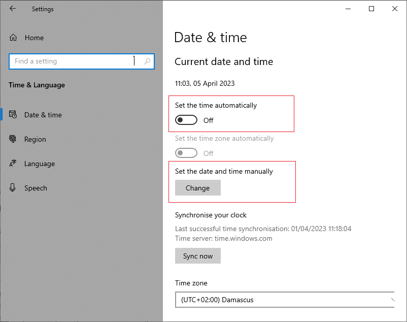 كما ذكرنا فإن أحد أسباب هذه المشكلة هو انتهاء صلاحية شهادة SSL. وعندها قد يعرض المتصفح الخطأ ERR_CERT_DATE_INVALID أو SEC_ERROR_EXPIRED_CERTIFICATE. قد تكمن المشكلة أحياناً في عدم ضبط ساعة النظام. لذا ننصحك بالتحقق من الوقت والتاريخ وضبطه إما يدوياً واختيار المنطقة الزمنية المناسبة أو ضبطه بشكل أوتوماتيكي.
