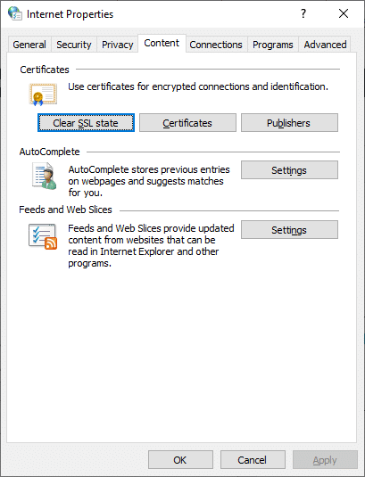 بدايةً انتقل للوحة التحكم Control Panel ثم ابحث عن Internet Options، ستظهر عندها نافذة جديدة اختر منها Content ثم اضغط Clear SSL state وأعد تشغيل المتصفح.