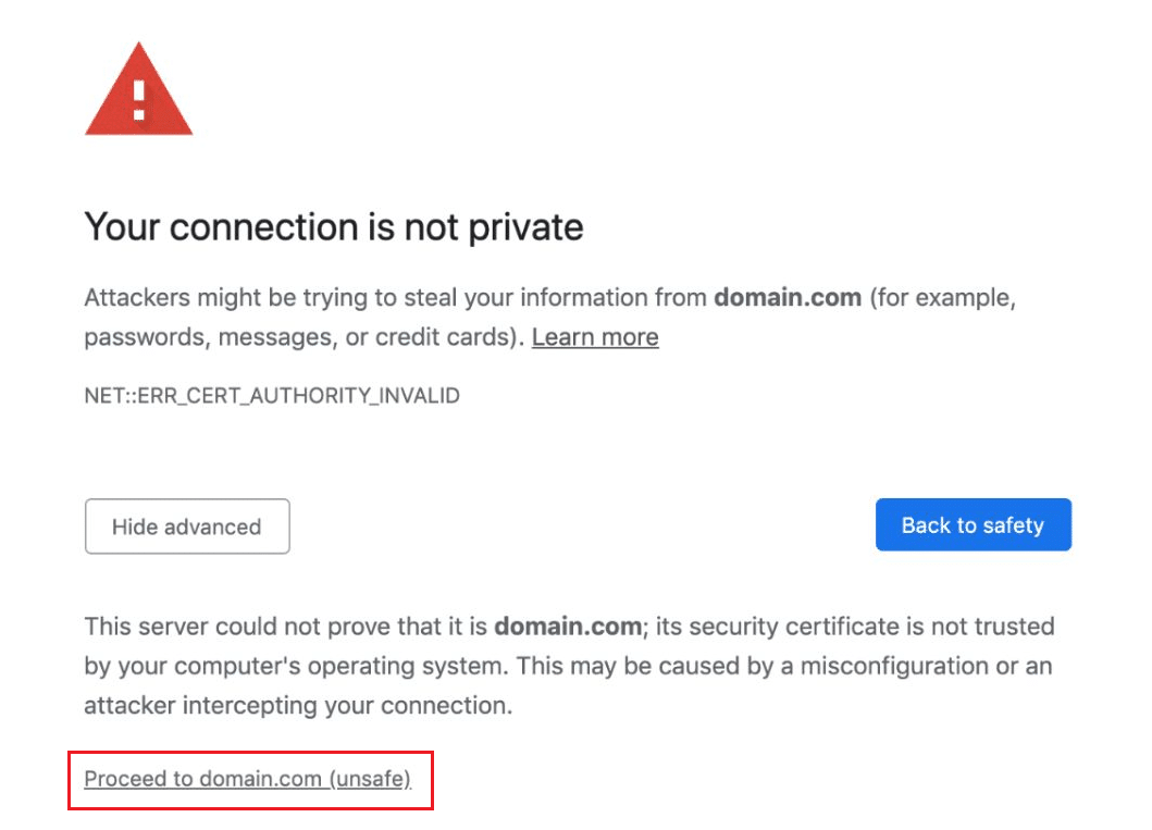 لتجاوز التنبيه في جوجل كروم اضغط Advanced ثم اختر Proceed to (اسم الموقع) في أسفل التنبيه.