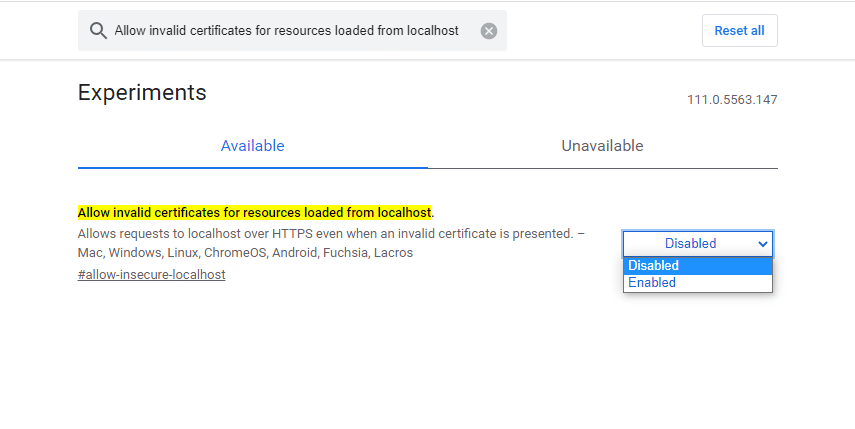 هناك طريقة أخرى للقيام بذلك عن طريقة Chrome flags. ما عليك سوى زيارة الرابط chrome://flags/ في المتصفح والبحث بعدها عن Allow invalid certificates for resources loaded from localhost وتفعيلها.