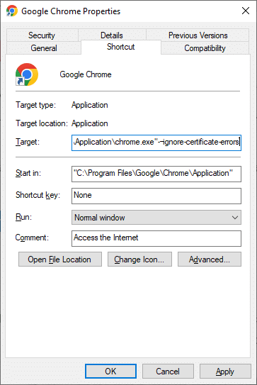 لإخفاء هذا التنبيه بشكل كلي انقر بزر الماوس الأيمن على أيقونة جوجل كروم واختر الخصائص Properties ثم وفي خانة Target أضف السطر التالي في نهاية العنوان المكتوب مسبقاً.
