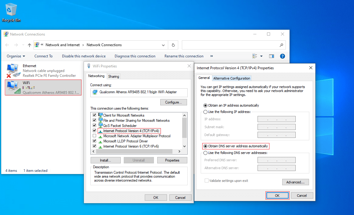 للقيام بذلك في ويندوز انتقل للوحة التحكم ثم اختر Network and Internet ثم Network and Sharing Center ثم اختر Change adapter settings، ومن هنا حدد الاتصال الذي تريد تعديله (عادةً هو الاتصال عن طريق شبكة الواي فاي) وانقر بزر الماوس الأيمن عليه واختر Properties ثم انقر مرتين على Internet Protocol Version 4 واختر Obtain DNS server address automatically.
