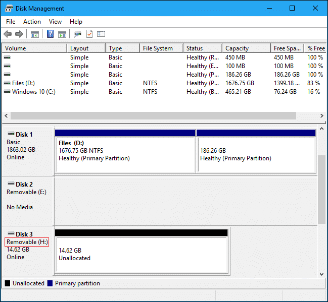 في هذه الحالة تظهر الفلاشة في أداة إدارة الأقراص ولكن يعلوها شريط أسود وكلمة Unallocated بجانبها. وهذا يعني أن الفلاشة فارغة تماماً وغير مهيئة للاستخدام.