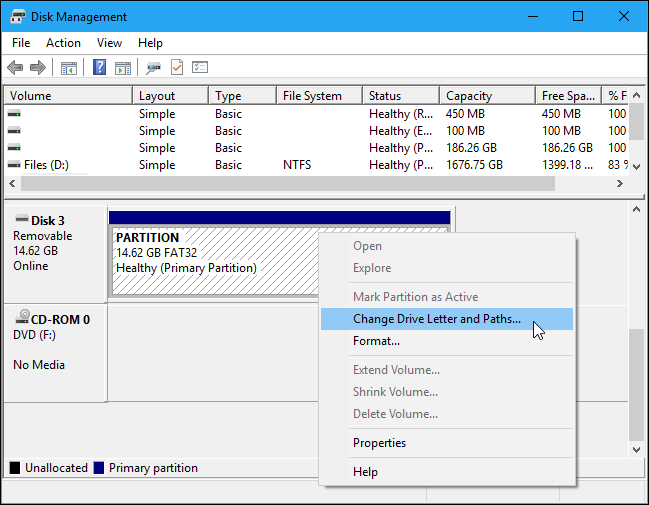 لمنح الفلاشة حرفاً انقر بزر الماوس الأيمن عليها واختر Change Drive Letter and Paths. إذا لم يكن بإمكانك النقر على هذا الخيار فهذا لأن الويندوز لم يتعرّف على نظام الملفات في الفلاشة، انتقل للفقرة التالية لمزيد من المعلومات.