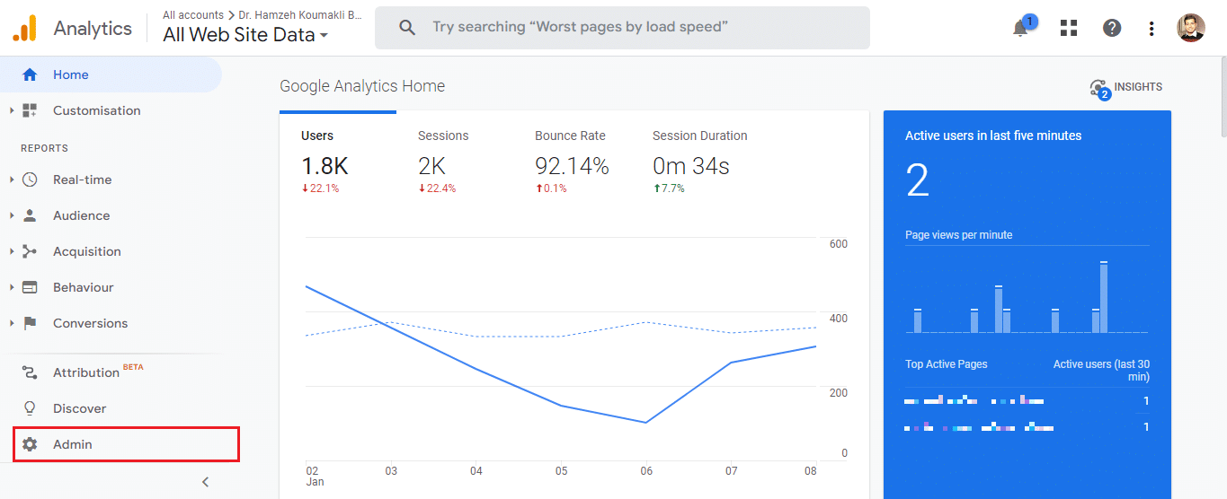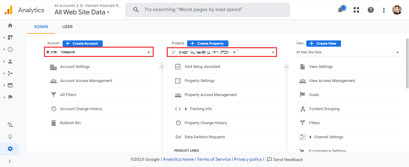 بدايةً عليك الحصول على هذا الكود. عليك تسجيل الدخول في حسابك في Google Analytics ومن ثم في القائمة اليسرى ابحث عن Admin