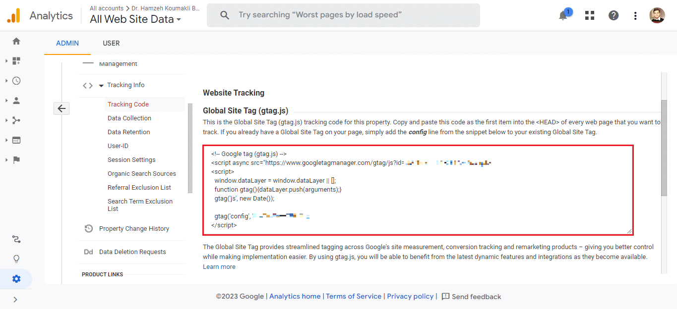 سيظهر عمود إلى الجانب الأيمن يتضمن الرقم الخاص بموقعك وحالته. نبحث هنا ضمن قسم Website Tracking عن مربع نصي يُدعى Global Site Tag (gtag.js)، حيث عليك نسخ محتواه والاحتفاظ به والانتقال للوحة تحكم الووردبريس.