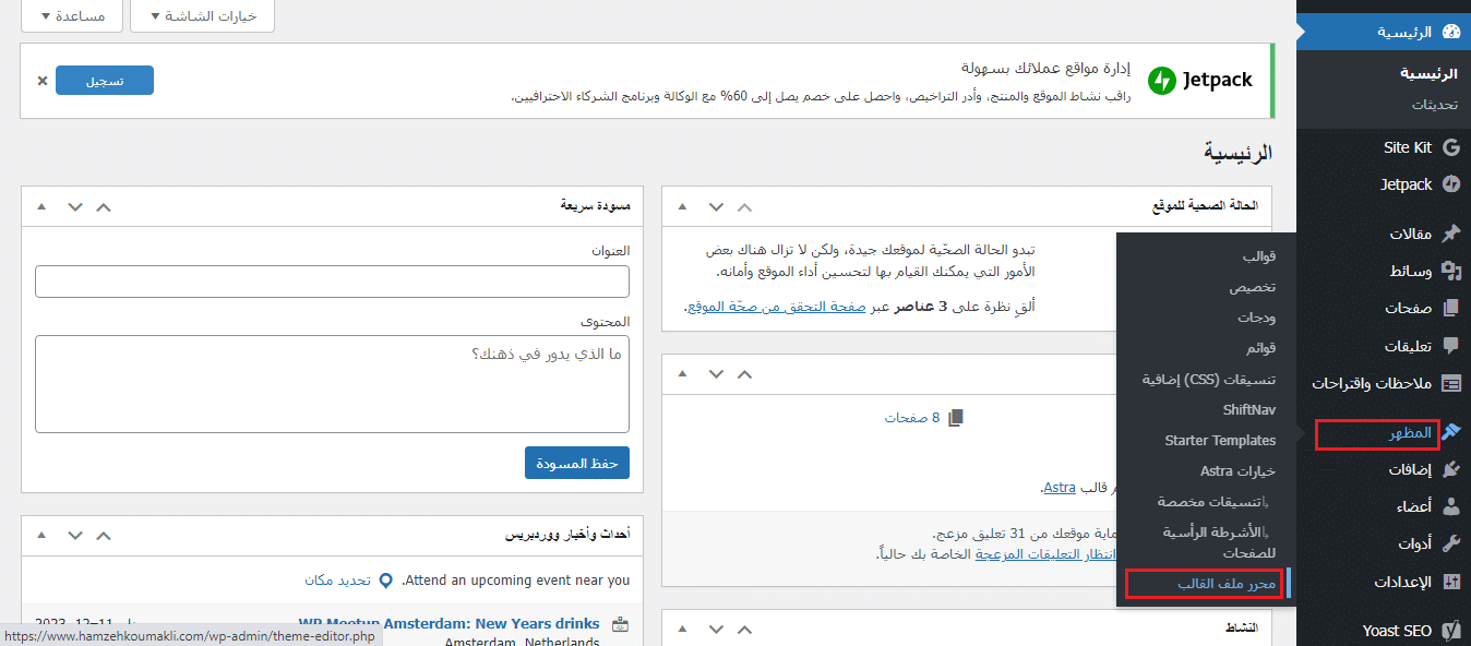 في لوحة تحكم الووردبريس ومن القائمة الجانبية اختر “المظهر” ومن ثم “محرر ملف القالب”