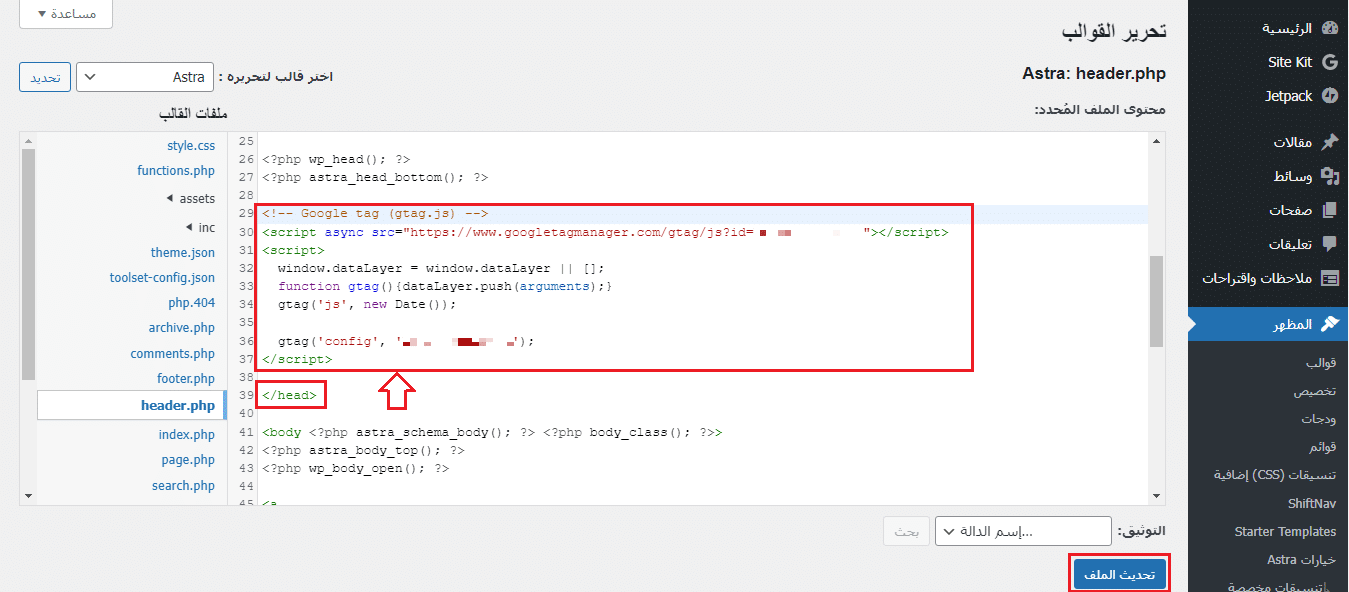 عندها سيفتح ملف header.php. وهنا عليك لصق الكود الذي أخذته من Google Analytics قبل إنهاء فقرة head، أي قبل </head> كما في الصورة: