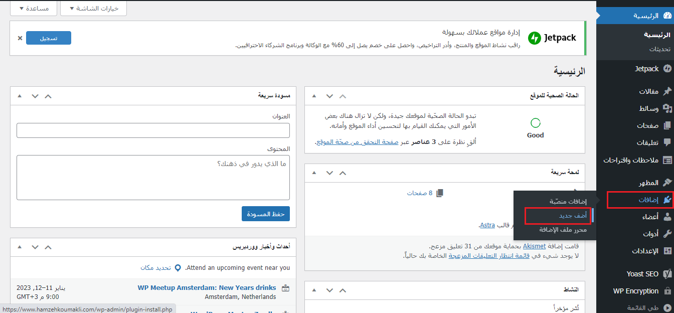 بعد تسجيل الدخول في ووردبريس، ومن خلال لوحة التحكم اتجه لـ”إضافات” واختر “أضف جديد”