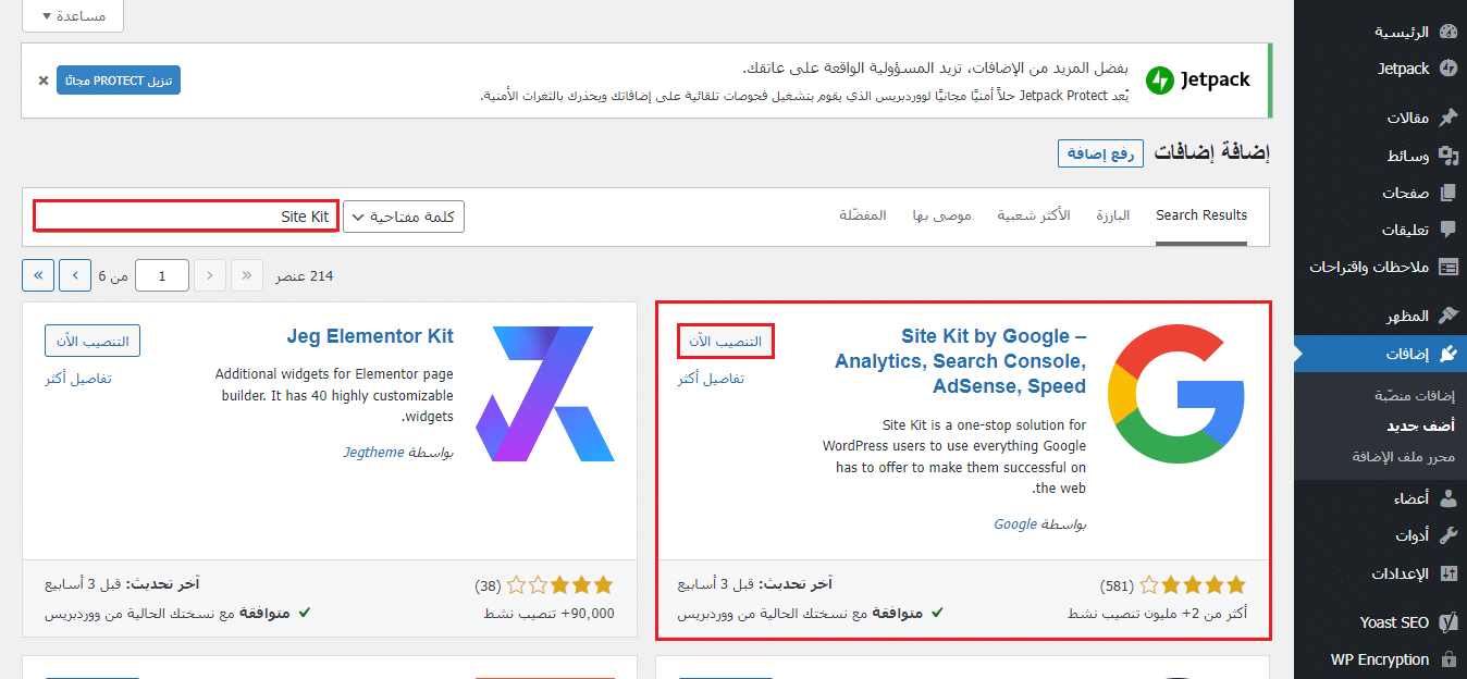 ابحث في الصفحة التالية عن إضافة Site Kit. وهي إضافة مصممة من قبل غوغل نفسها لمساعدتك في ربط موقعك الووردبريس بـGoogle Analytics بالإضافة لـGoogle Search Console (سنشرح كيفية إضافة موقعك له في مقال مستقبلاً)، وGoogle AdSense، وPageSpeed Insights.
