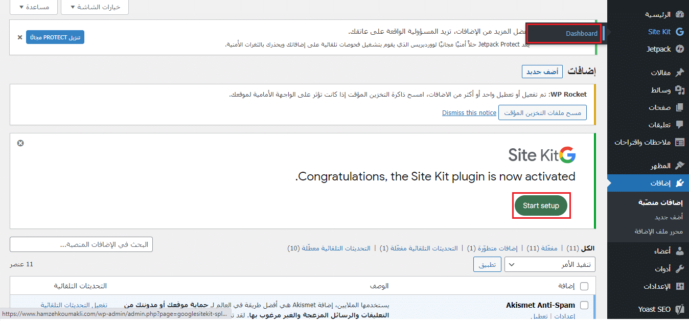 بعد اكتمال تفعيل الإضافة يمكنك البدء بإعدادها إما من خلال Start Setup أو ستجدها ضمن الشريط الجانبي تحت اسم Site Kit