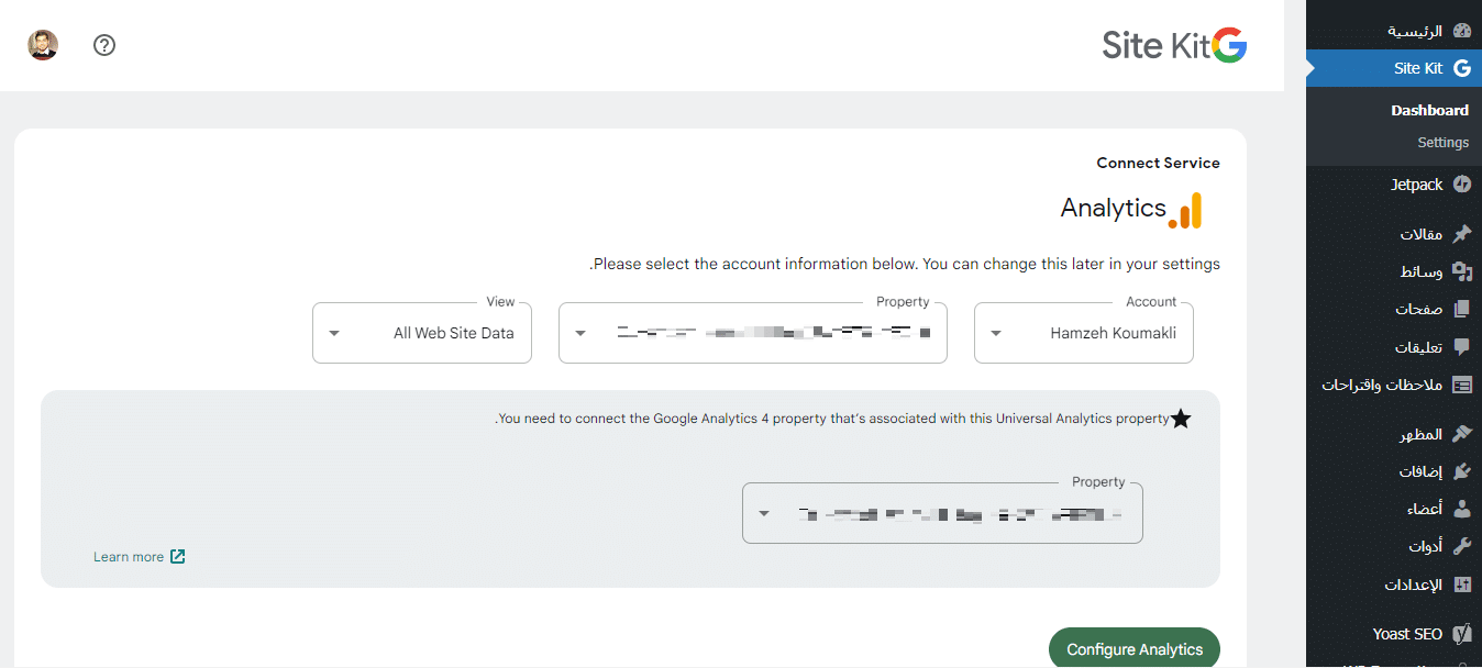 في الصفحة الجديدة اختر الحساب Account الذي تريده، والملكية Property (أي الموقع) الذي تريد ربطه كما في الصورة.