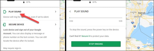 يمكنك اختيار Play Sound ليصدر موبايلك صوتاً يساعدك في العثور عليه. علماً أن الموبايل سيرن حتى وإن كان موضوعاً على وضع الصامت Silent أو غيره، وسيستمر بذلك لمدة 5 دقائق أو حتى يتم إلغاء قفله.