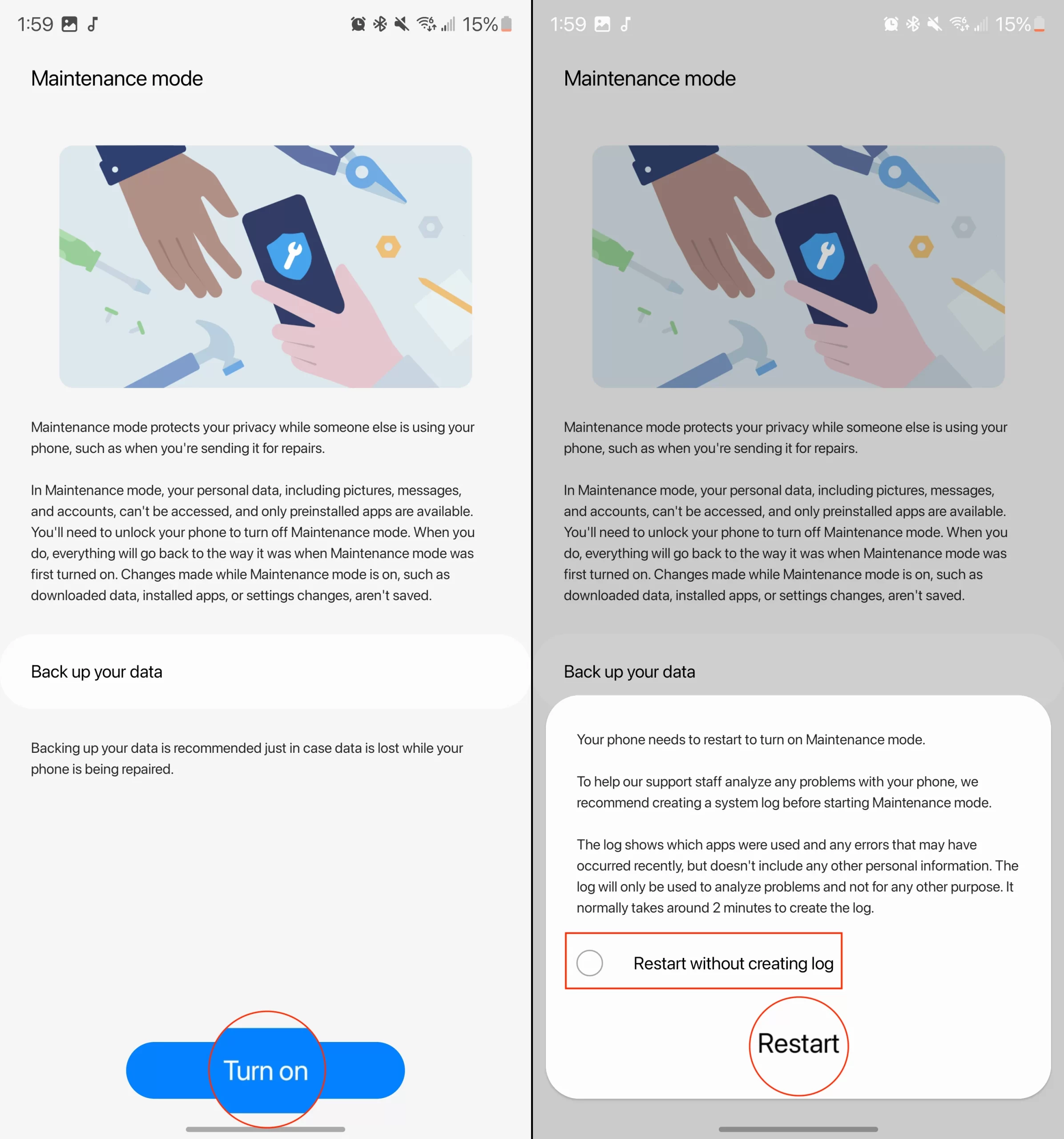 4. بعد الانتهاء من النسخة الاحتياطية اختر Turn on لتفعيل الوضع. سيعرض لك الموبايل تنبيهاً حيث يمكنك تفعيل خيار Restart without creating log، ننصحك هنا بعدم تفعيل هذا الخيار واختيار Restart مباشرةً.