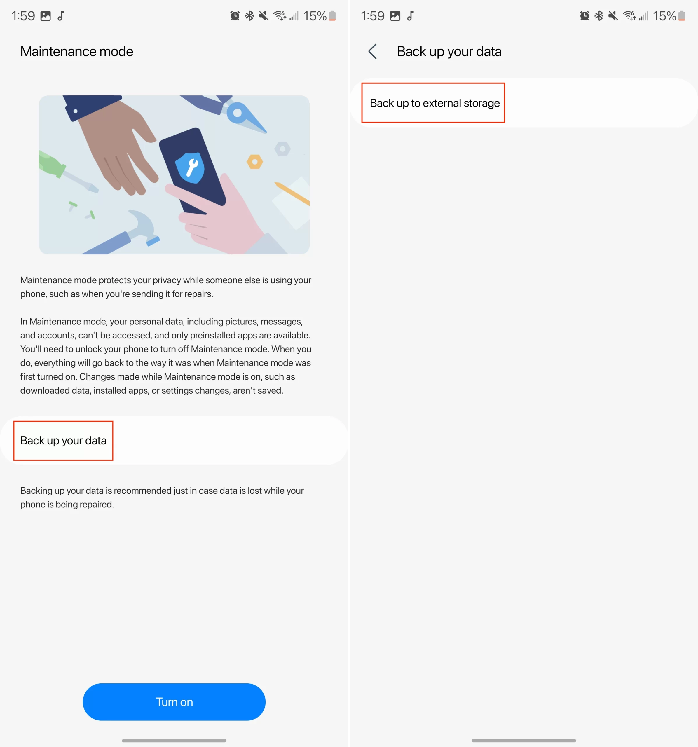 3. في الصفحة التالية اختر Back up your data ثم اختر إجراء نسخة احتياطية من بياناتك. يُنصح بذلك دوماً لأنه يتيح استعادة بياناتك إذا اضطر التقني لإجراء فورمات لموبايلك أثناء إصلاحه. يمكنك هنا وصل وحدة تخزين خارجية أياً كانت (USB أو SD Card) لحفظ النسخة الاحتياطية عليها.
