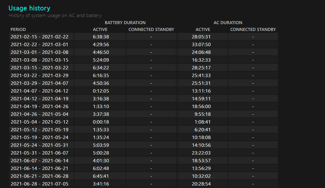 ما يهمنا في هذا التقرير هو قسم Usage History. من هنا يمكنك معرفة إن كنت تستخدم لابتوبك وهو متصل بالكهرباء AC أو على البطارية، ومدّة تشغيله أيضاً. وبالتالي يمكنك تقدير عمر البطارية بناءً على هذه المدة، علماً أن هذه المدة تُحسب حتى وإن كان اللابتوب في وضع النوم.